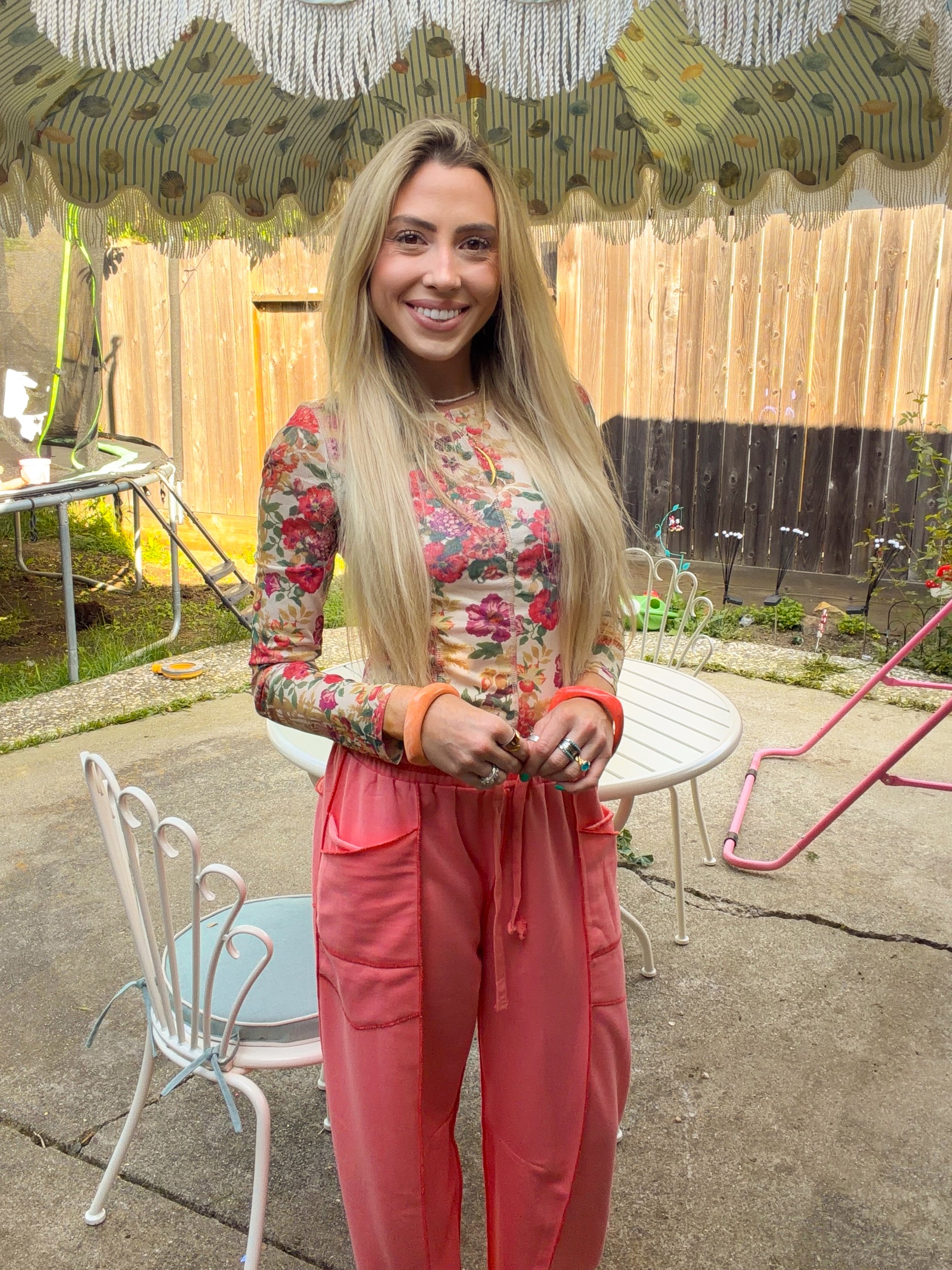A floral-print mesh top with the following features: • Princess seam bodice. • Boat neckline. • Long sleeves. • Lettuce-edge hem. • Sleeveless lining. • Cropped length. • Fitted silhouette.