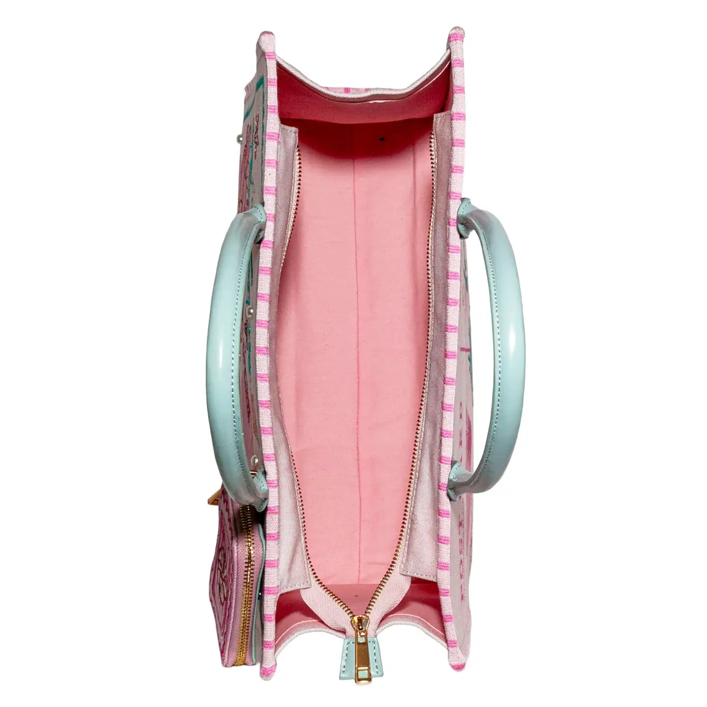 Materials & Details: Watercolor printed canvas Custom embroidery with pearl studs Smooth PU trim with gold-tone hardware Postage stamp inspired coin purse Double sided artwork Drop-zipper top closure for easy access Interior: Back wall zip pocket and two front wall pockets Dimensions Height: 28 cm Width: 38.5 cm Depth: 14 cm Handle Drop: 16 cm
